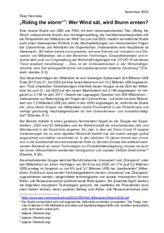 Eine neuere Studie von UBS und PWC mit dem vielversprechenden Titel „Riding the Strom“ untersucht die Anzahl, den Vermögensumfang, die Investitionsschwerpunkte und die Perspektiven der Milliardäre der Welt[1] bis zum Juli 2020. Insofern vermittelt die Studie auch einen interessanten Einblick in die Wechselwirkungen von ökonomischen Folgen der Corona-Krise und Aktivitäten der Superreichen. Insbesondere eine Hauptthese ist interessant: „Wir haben bereits zuvor gesehen, wie eine Kohorte von ‚Inovators‘ und ‚Disruptors‘ von Milliardären, die in den Bereichen Technologie, Gesundheitswesen und Industrie aktiv sind, zur Umgestaltung der Wirtschaft beigetragen hat. COVID-19 hat diesen Trend drastisch beschleunigt ... Dies ist ein Schlüsselmoment in der Wirtschaftsgeschichte, eine Zeit außergewöhnlicher schumpeterianischer kreativer Zerstörung“[2] (Forword, ebenda, S.5).