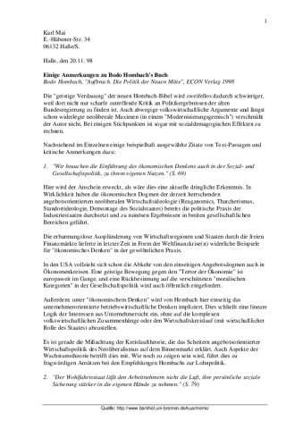 Die "geistige Verdauung" der neuen Hombach-Bibel wird zweifellos dadurch schwieriger, weil dort nicht nur scharfe zutreffende Kritik an Politikergebnissen der alten Bundesregierung zu finden ist. Auch abwegige volkswirtschaftliche Argumente und längst schon widerlegte neoliberale Maximen (in einem "Modernisierungsgemisch") verschmäht der Autor nicht. Bei einigen Stichpunkten ist sogar mit sozialdemagogischen Effekten zu rechnen.