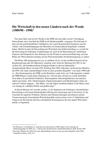 Fast neun Jahre sind seit der Wende in der DDR und acht Jahre seit der Vereinigung Deutschlands, dem Anschluß der DDR an die Bundesrepublik, vergangen. Ein Zeitraum in dem sich die gesellschaftlichen Verhältnisse, die sozial-ökonomischen Strukturen und die Arbeits- und Lebensbedingungen der Menschen in Ostdeutschland tiefgreifend verändert haben. Hierbei kommt der Entwicklung der Wirtschaft eine Schlüsselstellung zu; sowohl für die Bewertung der bisherigen Veränderungen als auch für die Beurteilung der zukünftigen Chancen und Perspektiven. Der Zeitraum seit der Wende ist auch ausreichend lang, um eine Bilanz der Wirtschaftsentwicklung und der Wirtschaftspolitik der Bundesregierung zu ziehen.