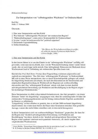 In den letzten Jahren ist es um den Eintritt in ein “selbsttragendes Wachstum” auffällig still geworden, wenn man davon absieht, dass von der Wirtschaftsforschung immer wieder betont wurde, dies sei noch lange nicht erreicht. Eine tiefergehende Diskussion der Merkmale dieser Wachstumsart fand in Verbindung mit ostdeutschen Spezifika kaum statt.