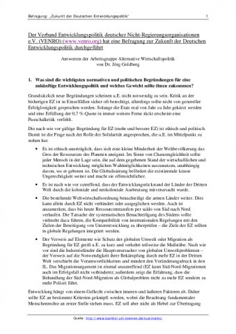 Grundsätzlich neue Begründungen scheinen u.E. nicht notwendig zu sein. Kritik an der bisherigen EZ ist in Einzelfällen sicher oft berechtigt, allerdings sollte nicht von genereller Erfolglosigkeit gesprochen werden: Solange die Etats real von Jahr zu Jahr gekürzt werden und eine Erfüllung der 0,7 %-Quote in immer weitere Ferne rückt erscheint eine Pauschalkritik verfehlt.