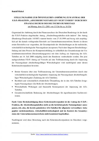 Gegenstand der Anhörung durch den Finanzausschuss des Deutschen Bundestags ist der durch die F.D.P.-Fraktion eingebrachte Antrag „Abschreibungstabellen nicht ändern“. Der Antrag (Bundestags-Drucksache 14/1887) stammt bereits vom 27.10.1999 und bezog sich ursprünglich auf die damals vorliegenden Entwürfe zur Unternehmenssteuerreform.