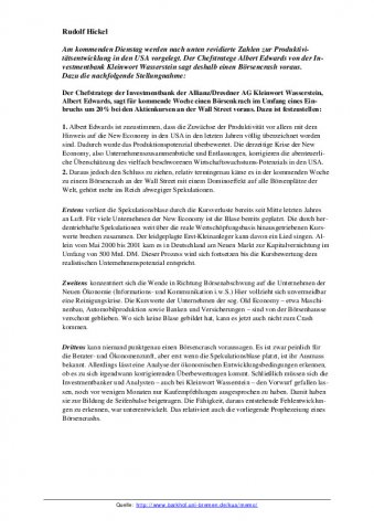 Am kommenden Dienstag werden nach unten revidierte Zahlen zur Produktivitätsentwicklung in den USA vorgelegt. Der Chefstratege Albert Edwards von der Investmentbank Kleinwort Wasserstein sagt deshalb einen Börsencrash voraus. Dazu die nachfolgende Stellungnahme
