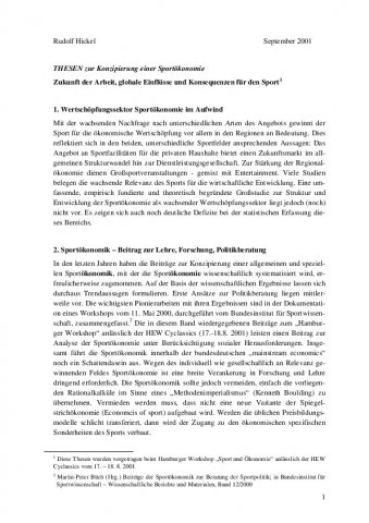 Mit der wachsenden Nachfrage nach unterschiedlichen Arten des Angebots gewinnt der Sport für die ökonomische Wertschöpfung vor allem in den Regionen an Bedeutung. Dies reflektiert sich in den beiden, unterschiedliche Sportfelder ansprechenden Aussagen: Das Angebot an Sportfazilitäten für die privaten Haushalte bietet einen Zukunftsmarkt im allgemeinen Strukturwandel hin zur Dienstleistungsgesellschaft. Zur Stärkung der Regionalökonomie dienen Großsportveranstaltungen - gemixt mit Entertainment. Viele Studien belegen die wachsende Relevanz des Sports für die wirtschaftliche Entwicklung. Eine umfassende, empirisch fundierte und theoretisch begründete Großstudie zur Struktur und Entwicklung der Sportökonomie als wachsender Wertschöpfungssektor liegt jedoch (noch) nicht vor. Es zeigen sich auch noch deutliche Defizite bei der statistischen Erfassung dieses Bereichs.