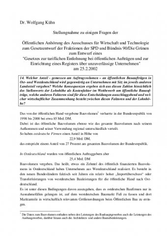 Stellungnahme zu einigen Fragen der Öffentlichen Anhörung des Ausschusses für Wirtschaft und Technologie zum Gesetzentwurf der Fraktionen der SPD und Bündnis 90/Die Grünen