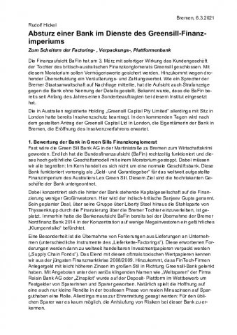 Fast wäre die Green Sill Bank AG in der Martinistraße zu Bremen zum Wirtschaftskrimi geworden. Endlich hat die Bundesfinanzaufsicht (BaFin) rechtzeitig funktioniert und dieses hoch gefährliche Geschäftsmodell mit einem Moratorium gestoppt. Dabei müssen wir alle begreifen: Im Kern handelt es sich nicht um eine normale Geschäftsbank. Diese Bank funktioniert vorrangig als „Geld- und Garantiegeber“ für das weltweit aufgestellte Finanzimperium des Australiers Lex Green Sill. Diesem Ziel sind die hochriskanten Geschäfte der Bank untergeordnet.