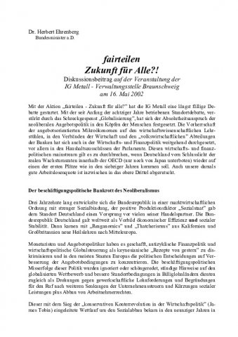 Mit der Aktion „fairteilen - Zukunft für alle?” hat die IG Metall eine längst fällige Debatte gestartet. Mit der seit Anfang der achtziger Jahre betriebenen Standortdebatte, verstärkt durch das Schreckgespenst „Globalisierung”, hat sich der Absolutheitsanspruch der neoliberalen Angebotspolitik in den Köpfen der Menschen festgesetzt.
