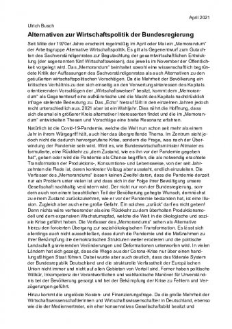 Seit Mitte der 1970er Jahre erscheint regelmäßig im April oder Mai ein „Memorandum“ der Arbeitsgruppe Alternative Wirtschaftspolitik. Es gilt als Gegenentwurf zum Gutachten des Sachverständigenrates zur Begutachtung der gesamtwirtschaftlichen Entwicklung (der sogenannten fünf Wirtschaftsweisen), das jeweils im November der Öffentlichkeit vorgelegt wird. Das „Memorandum“ beinhaltet sowohl eine wissenschaftlich begründete Kritik der Auffassungen des Sachverständigenrates als auch Alternativen zu den geäußerten wirtschaftspolitischen Vorschlägen. Da die Mehrheit der Bevölkerung ein kritisches Verhältnis zu den sich einseitig an den Verwertungsinteressen des Kapitals orientierenden Vorschlägen der „Wirtschaftsweisen“ besitzt, kommt dem „Memorandum“ als Gegenentwurf eine aufklärerische und die Macht des Kapitals nachdrücklich infrage stellende Bedeutung zu. Das „Echo“ hierauf fällt in den einzelnen Jahren jedoch recht unterschiedlich aus. 2021 aber ist ein Wahljahr. Dies nährt die Hoffnung, dass sich diesmal ein größerer Kreis alternativer Interessenten findet und die im „Memorandum“ entwickelten Thesen und Vorschläge eine breite Resonanz erfahren.