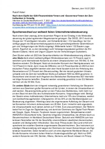 Nach einem über zwanzig Jahre dauernden Ringen ist der Einstieg in die Mindestbesteuerung der global agierenden Megakonzerne gelungen. Die OECD, 2017 durch die Gruppe der 19 wichtigsten Industrie- und Schwellenländer + EU beauftragt, hat Vorschläge gegen die Steuervermeidungspraxis durch grenzübergreifende Gewinnkürzungen und Verlagerungen der Multis vorgelegt. Mittlerweile haben 132 Staaten zugestimmt. Ärgerlich ist, zu den derzeitigen acht Verweigerungsstaaten gehören die EU-Staaten Estland, Irland und Ungarn (Zypern hat die Verhandlungen boykottiert).