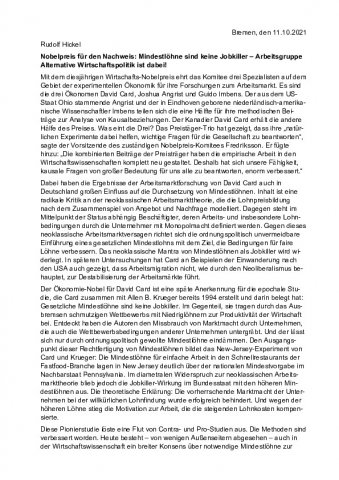 Die „Arbeitsgruppe Alternative Wirtschaftspolitik“ darf sich mit ihrem frühen wirtschaftswissenschaftlichen Engagement für einen gesetzlichen Mindestlohn in Deutschland bestätigt fühlen. Denn dessen Einsatz gegen die Ausbreitung prekärer Erwerbsarbeit im Niedriglohnsektor hat früh Eingang in die „Memoranden“ gefunden. Dazu sind explizit die Studien vor allem David Card, die von den neoliberal beeinflussten Wirtschaftsforschungsinstituten angezweifelt wurden, verarbeitet worden. Bei dieser Ehrung einer undogmatischen Beschreibung der Funktionsweise von Arbeitsmärkten, die die (missbrauchte) Unternehmensmacht gegenüber der systemischen Abhängigkeit der Beschäftigten betont, sind wir mit unserer Alternativökonomik immer gern dabei.