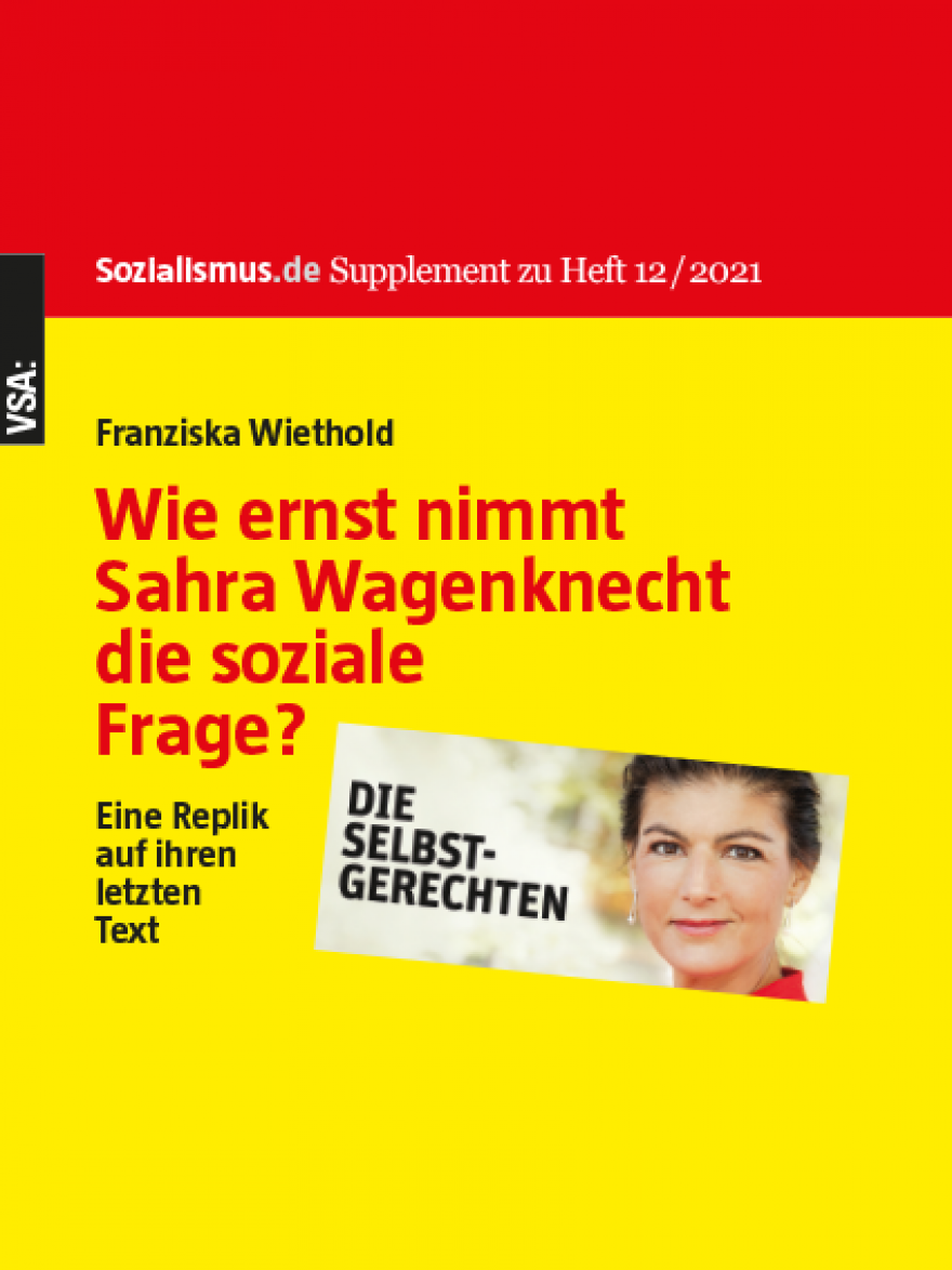 »Die Differenzen zu Sahra Wagenknechts Positionen existieren einerseits in zentralen Politikinhalten: Stärkung des Nationalstaates versus Internationaler Organisationen; Umgang mit Flüchtlingsbewegungen, mit Klimakrise, mit Gleichberechtigungspolitik und gesellschaftlicher Vielfalt. Die Differenzen beruhen gleichzeitig auf einem anderen handlungsleitenden Interesse: S. Wagenknecht beschreibt gesellschaftliche Prozesse durch die Brille eines vorher festgelegten Werturteils, das wichtige Differenzierungen ausklammert. Sie belegt Schichten/Milieus entgegen der Fakten mit eindeutigen positiven/negativen Zuschreibungen. Sie macht aus unterschiedlichen politischen Linien innerhalb der Linken Gegensätze. Sie negiert wechselseitige Lernprozesse in den verschiedenen Bewegungen, und beharrt auf ihrer Gegenüberstellung der sozialen und der kulturellen Frage. Zugleich bleibt ihr Interesse an der sozialen Frage merkwürdig abstrakt und damit nicht glaubwürdig. (...)