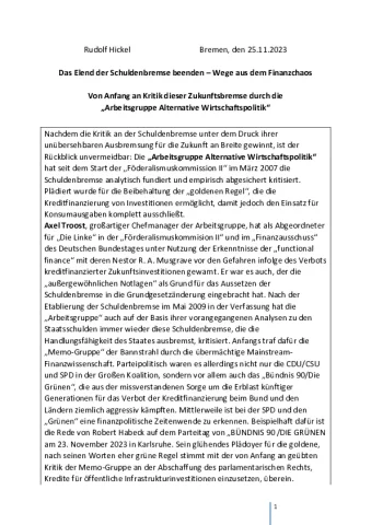 Axel Troost, großartiger Chefmanager der Arbeitsgruppe, hat als Abgeordneter für „Die Linke“ in der „Förderalismuskommision II“ und im „Finanzausschuss“ des Deutschen Bundestages unter Nutzung der Erkenntnisse der „functional finance“ mit deren Nestor R. A. Musgrave vor den Gefahren infolge des Verbots kreditfinanzierter Zukunftsinvestitionen gewarnt. Er war es auch, der die „außergewöhnlichen Notlagen“ als Grund für das Aussetzen der Schuldenbremse in die Grundgesetzänderung eingebracht hat. Nach der Etablierung der Schuldenbremse im Mai 2009 in der Verfassung hat die „Arbeitsgruppe“ auch auf der Basis ihrer vorangegangenen Analysen zu den Staatsschulden immer wieder diese Schuldenbremse, die die Handlungsfähigkeit des Staates ausbremst, kritisiert. Anfangs traf dafür die „Memo-Gruppe“ der Bannstrahl durch die übermächtige Mainstream-Finanzwissenschaft. Parteipolitisch waren es allerdings nicht nur die CDU/CSU und SPD in der Großen Koalition, sondern vor allem auch das „Bündnis 90/Die Grünen“, die aus der missverstandenen Sorge um die Erblast künftiger Generationen für das Verbot der Kreditfinanzierung beim Bund und den Ländern ziemlich aggressiv kämpften. Mittlerweile ist bei der SPD und den „Grünen“ eine finanzpolitische Zeitenwende zu erkennen. Beispielhaft dafür ist die Rede von Robert Habeck auf dem Parteitag von „Bündnis 90 /Die Grünen am 23. November 2023 in Karlsruhe. Sein glühendes Plädoyer für die goldene, nach seinen Worten eher grüne Regel stimmt mit der von Anfang an geübten Kritik der Memo-Gruppe an der Abschaffung des parlamentarischen Rechts, Kredite für öffentliche Infrastrukturinvestitionen einzusetzen, überein. Auch in der Wirtschaftswissenschaft setzt sich endlich finanzpolitische Vernunft durch. Dafür steht die kluge Argumentation von Michael Hüther vom „Institut der deutschen Wirtschaft“. Allerdings greift die Begründung, infolge der Klimakrise sei die Schuldenbremse „aus der Zeit gefallen“ zu kurz. Vielmehr offenbart sich heute besonders stark das von Anfang schädliche Verbot der Kreditfinanzierung von Zukunftsinvestitionen in alle Bereiche der Infrastruktur.
