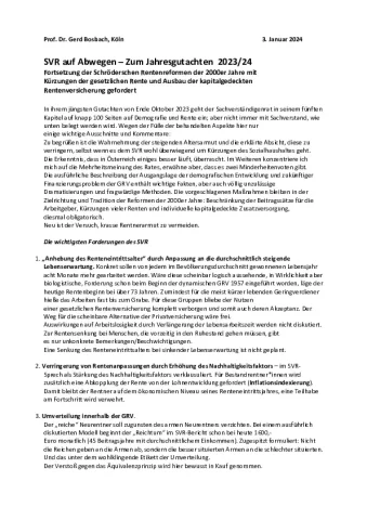 Zu begrüßen ist die Wahrnehmung der steigenden Altersarmut und die erklärte Absicht, diese zu verringern, selbst wenn es dem SVR wohl überwiegend um Kürzungen des Sozialhaushaltes geht. Die Erkenntnis, dass in Österreich einiges besser läuft, überrascht. Im Weiteren konzentriere ich mich auf die Mehrheitsmeinung des Rates, erwähne aber, dass es zwei Minderheitenvoten gibt. Die ausführliche Beschreibung der Ausgangslage der demografischen Entwicklung und zukünftiger Finanzierungsproblem der GRV enthält wichtige Fakten, aber auch völlig unzulässige Dramatisierungen und fragwürdige Methoden. Die vorgeschlagenen Maßnahmen bleiben in der Zielrichtung und Tradition der Reformen der 2000er Jahre: Beschränkung der Beitragssätze für die Arbeitgeber, Kürzungen vieler Renten und individuelle kapitalgedeckte Zusatzversorgung, diesmal obligatorisch.