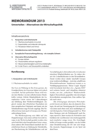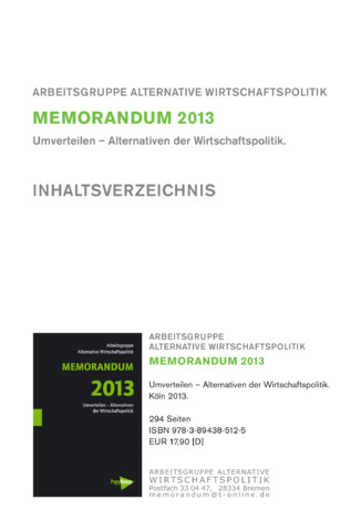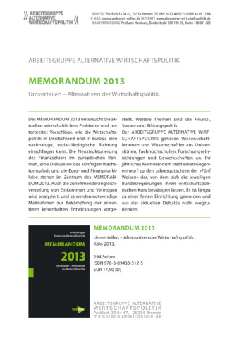 Das MEMORANDUM 2013 untersucht die aktuellen wirtschaftlichen Probleme und unterbreitet Vorschläge, wie die Wirtschaftspolitik in Deutschland und in Europa eine nachhaltige, sozial-ökologische Richtung einschlagen kann. Die Neustrukturierung des Finanzsektors im europäischen Rahmen, eine Diskussion des künftigen Wachstumspfads und die Euro- und Finanzmarktkrise stehen im Zentrum des MEMORANDUM 2013. Auch die zunehmende Ungleichverteilung von Einkommen und Vermögen wird analysiert, und es werden notwendige Maßnahmen zur Bekämpfung der erwarteten krisenhaften Entwicklungen vorgestellt. Weitere Themen sind die Finanz-, Steuer- und Bildungspolitik.