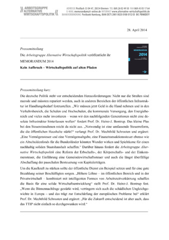 Das MEMORANDUM 2014 untersucht die aktuelle wirtschaftliche Lage und unterbreitet Vorschläge, wie die derzeitigen Probleme bekämpft werden können. Notwendig ist eine nachhaltige, sozial-ökologisch ausgerichtete Wirtschaftspolitik, die die Krisenursachen direkt angeht. Eine alternative Finanz- und Steuerpolitik und eine Reform des Länderfinanzausgleichs stehen im Mittelpunkt der Analyse. Darüber hinaus werden Vorschläge zu einer Neustrukturierung des Finanzsektors im europäischen Rahmen gemacht sowie die Banken- und Finanzregulierung behandelt. Weitere Bestandteile des MEMORANDUM 2014 sind die Energie- und Bildungspolitik sowie Aspekte der Kommunalpolitik.