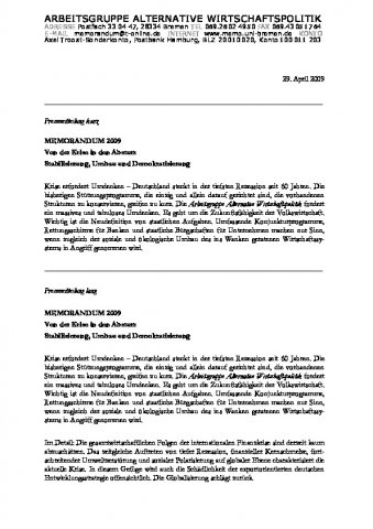Die Arbeitsgruppe Alternative Wirtschaftspolitik hat die neoliberale Wirtschaftspolitik seit vielen Jahren kritisiert und durchgreifende Richtungsänderungen gefordert. Diese sollten darauf zielen, den Binnenmarkt zu stärken und dessen Ausweitung mit dem ökologischen Umbau, einer progressiven Sozialstaatsreform und dem Ausbau eines demokratischen öffentlichen Sektors zu verbinden. In der aktuellen Finanzmarktkrise kommt es zudem darauf an, die Funktionsfähigkeit des Finanzsystems durch unmittelbare Stabilisierungsmaßnahmen und mittelfristige Umgestaltung zu gewährleisten.