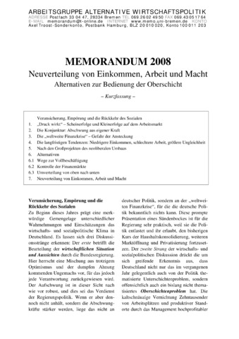 Hierzu will auch das diesjährige Memorandum beitragen. Wir wollen darin zeigen, dass die von der Regierung mit triumphierender Geste herausgestellten beschäftigungspolitischen gungspolitischen Erfolge fragwürdig sind und vor allem eine massive Entwertung der Arbeit beinhalten; dass die Konjunktur nicht robust, sondern sehr fragil ist und dies seine Ursache nicht in der amerikanischen Hypothekenkrise, sondern in der Schwäche der deutschen Binnenwirtschaft hat; dass hierin letztlich die langfristige Tendenz einer zunehmend falschen Verteilung von Einkommen, Arbeit und Macht zum Ausdruck kommt. Die Überwindung der anhaltenden gesamtwirtschaftlichen und schärfer werdenden sozialen Probleme bedarf daher einer Neuverteilung von Einkommen, Arbeit und Macht, die durch starke soziale Bewegungen vorangetrieben wird und zu einer gründlichen Demokratisierung der Wirtschaft führt.