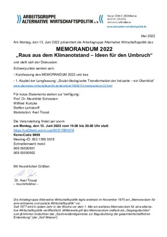 Am Montag, den 13. Juni 2022 präsentiert die Arbeitsgruppe Alternative Wirtschaftspolitik das MEMORANDUM 2022 „Raus aus dem Klimanotstand – Ideen für den Umbruch“ und stellt sich der Diskussion.