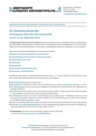 34. Sommerschule der Arbeitsgruppe Alternative Wirtschaftspolitik vom 25. bis 29. September 2023